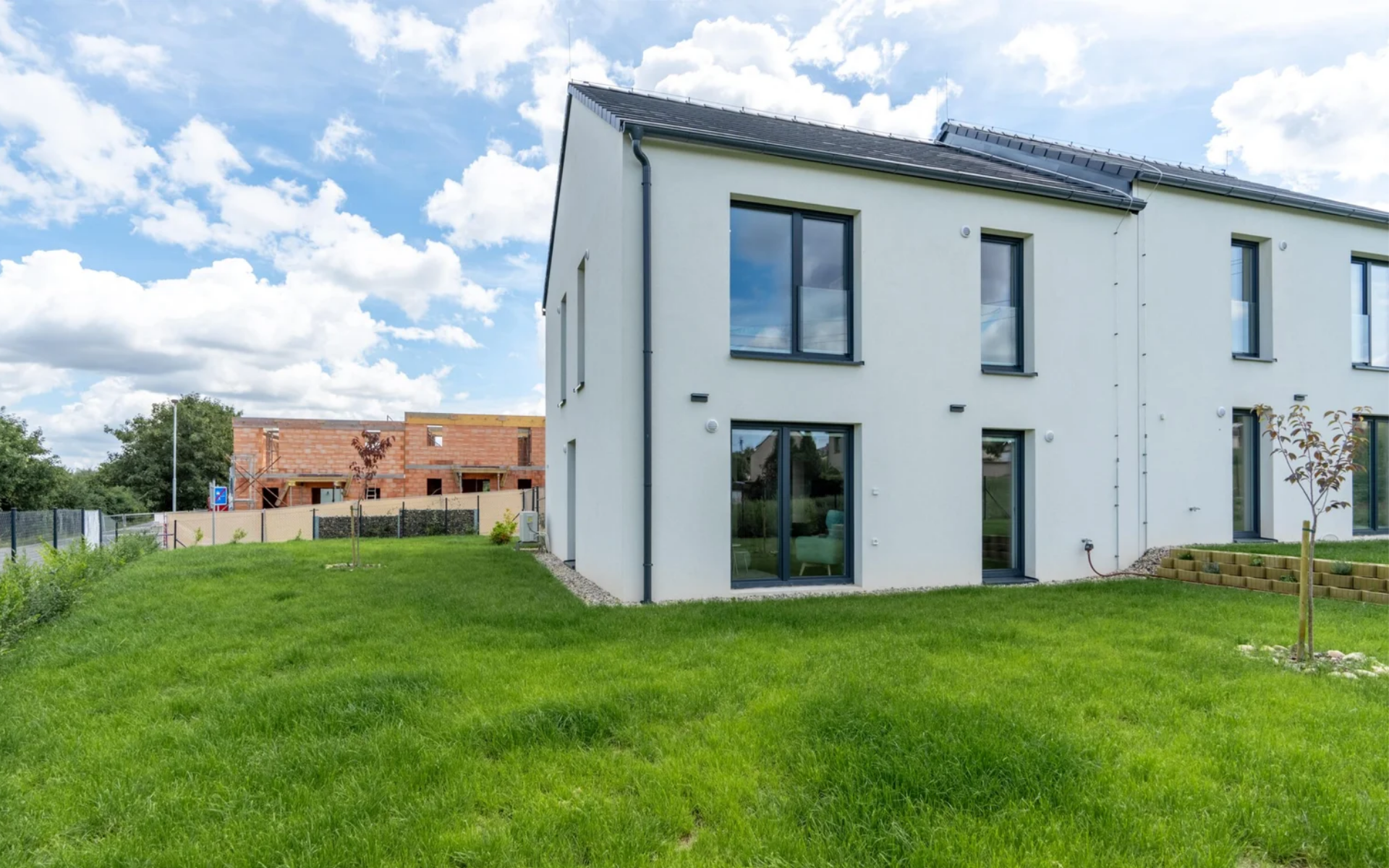 Ve zkratce, dvaadvacet prostorných bytů se zahradou v moderních domech, spojení pěší zónou doplněnou zelení a park s hřištěm o rozloze téměř 1000 m2.