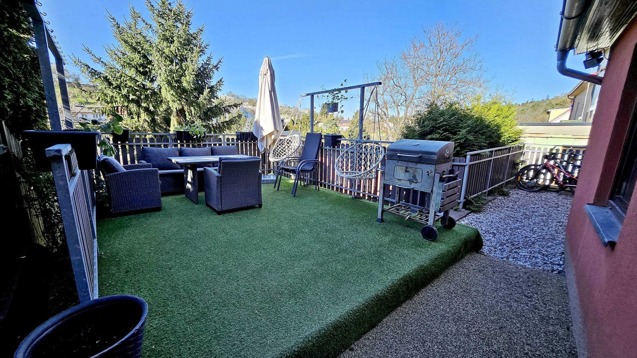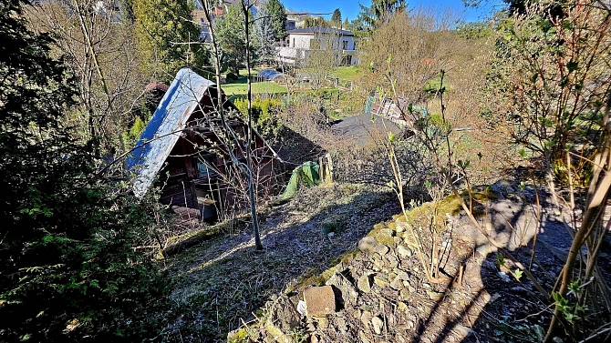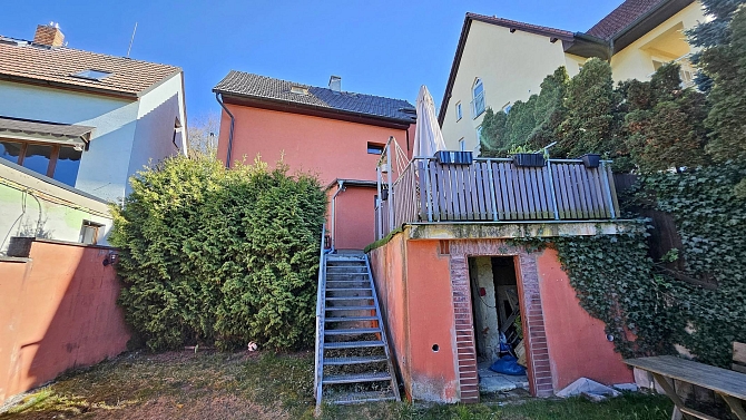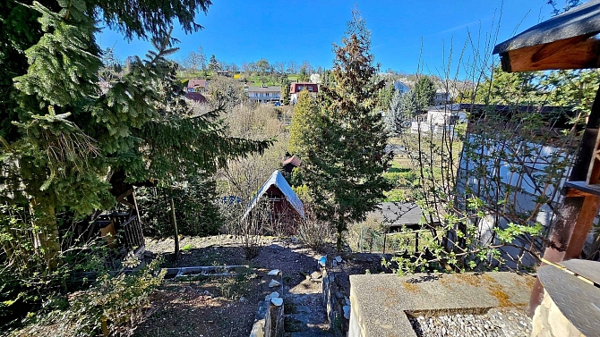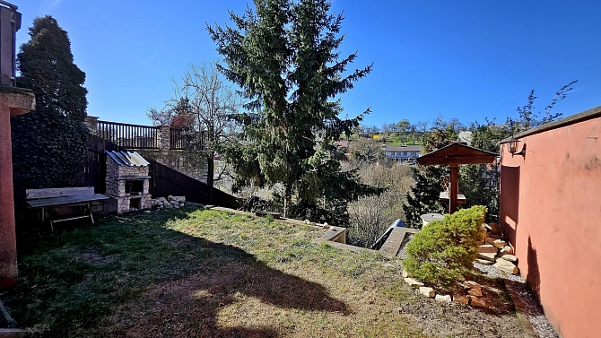 Zahrada za domem je kaskádovitá, v úrovni domu se nachází terasa s posezením a také studna pro užívání na zahradu.