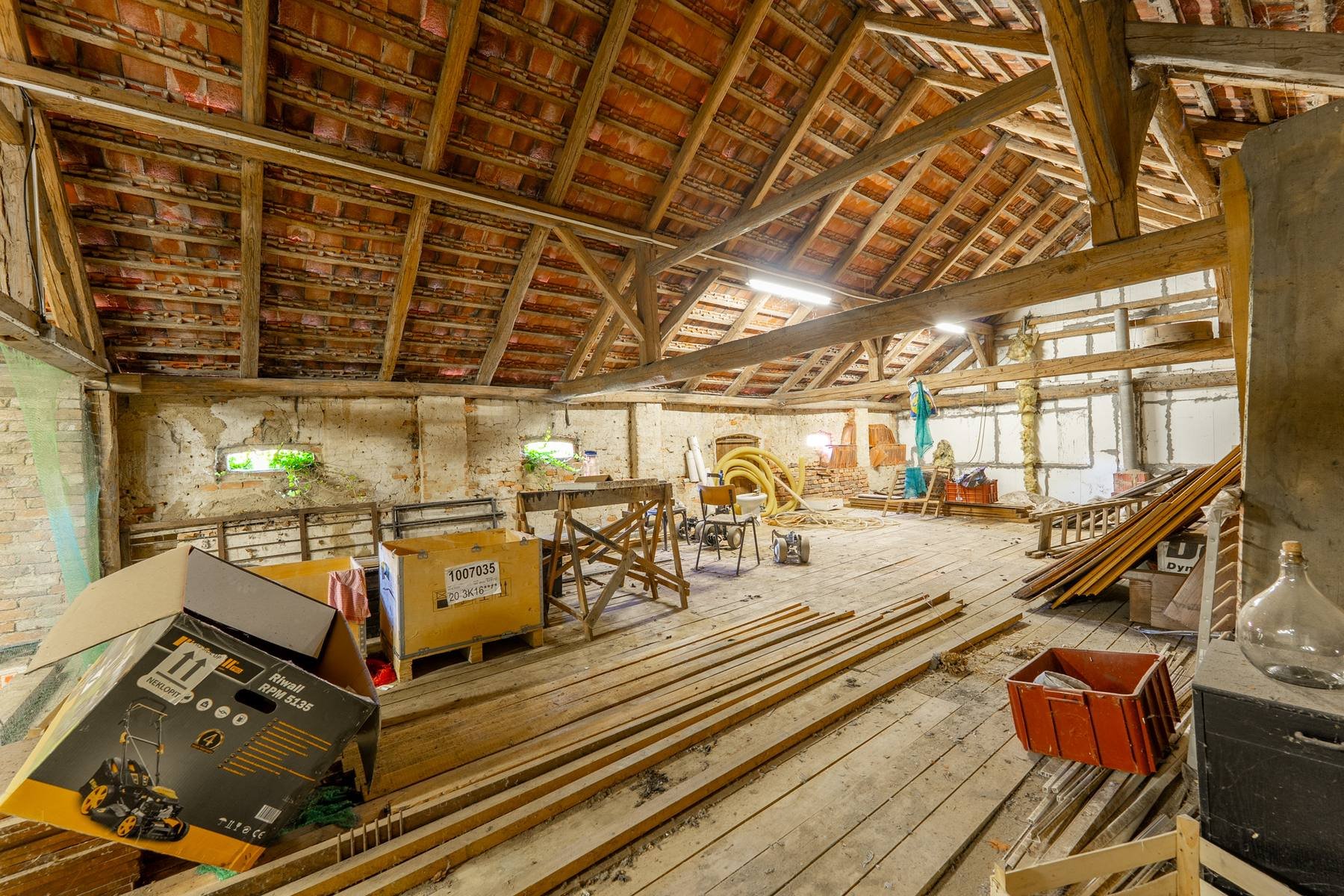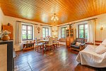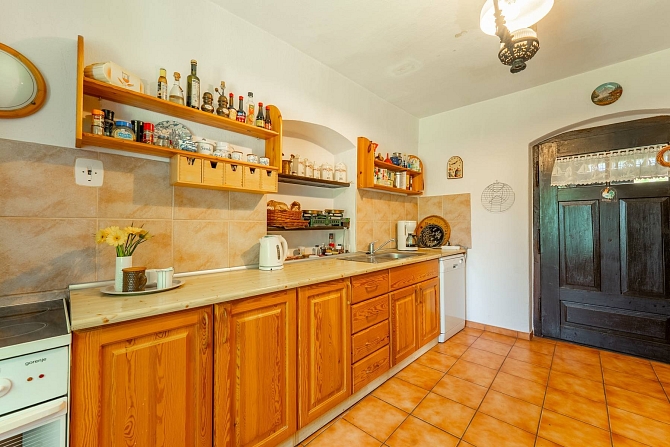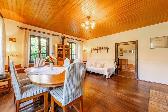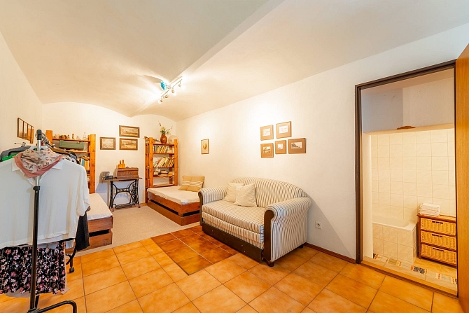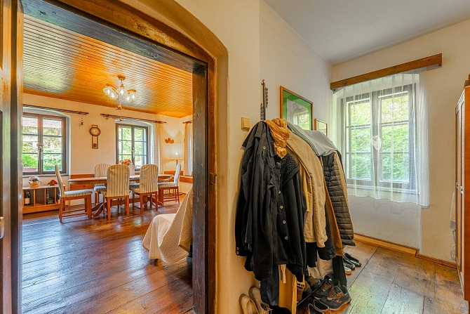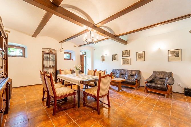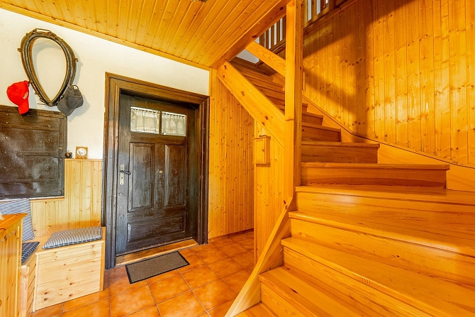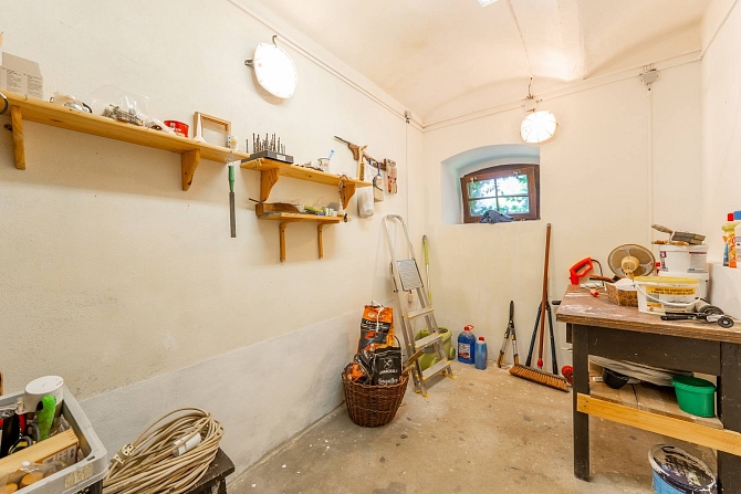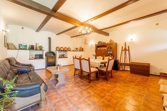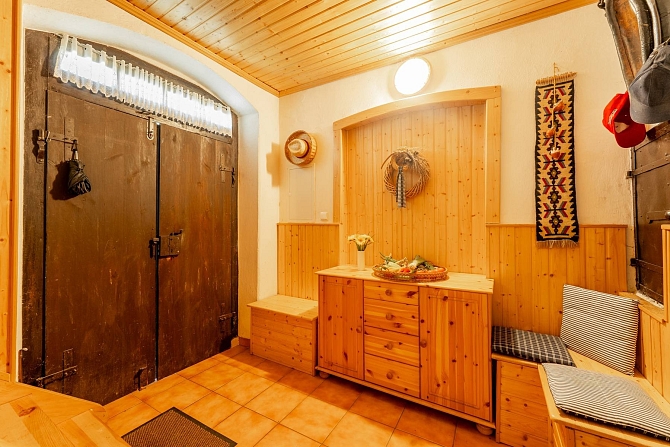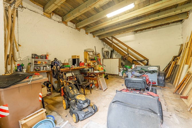 Z hospodářské části domu je vybudována kůlna na dřevo a náčiní s tím spojené. Pro pány je zde praktická dílna pro jejich kutilské umění. A z bývalých stájí je vybudovaný naprosto pohodový prostor pro pořádání rodinných oslav, nebo posezení s přáteli. Poslední část je ponechána v duchu původní stodoly, kde je dostatek místa pro zaparkování traktůrku na sekání trávy, vozíku za auto a mnoho dalších potřebných věcí, které se vám hodí pro údržbu chalupy a jejího okolí. Ze stodoly je dřevěné schodiště, které vede na půdu nad hospodářskou částí a zde je prostor pro vaši fantazii při budování dalších obytných místností a nebo pro vaše sportovní výkony u pinpongového stolu.