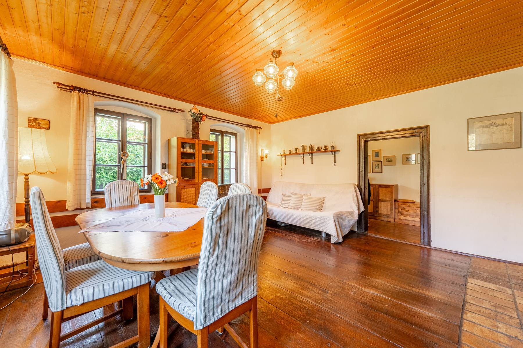 Obytná část je řešena vstupní halou, ze které je vstup do kuchyně, která navazuje na hlavní obytnou místnost, ze které se vchází do přilehlého pokoje, který momentálně slouží jako šatna. Z haly se dále vstupuje do ložnice, na kterou navazuje koupelna, která je vybavena vanou, umyvadlem, koupelnovým nábytkem a nechybí ani prostor na pračku. Dále je z haly vstup do prostorného sklepa a nechybí dřevěné schodiště do podkroví. V podkroví domu se nachází celkem tři ložnice a koupelna, která je vybavena sprchovým koutem, umyvadlem, toaletou a bidetem.