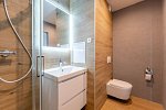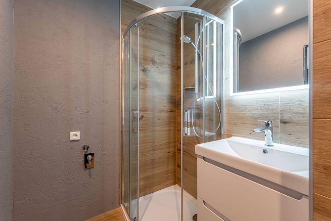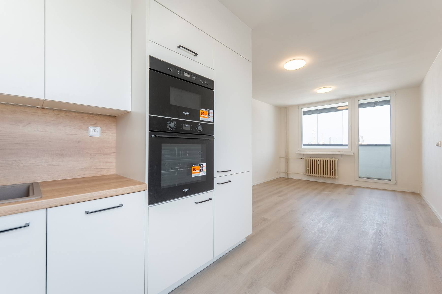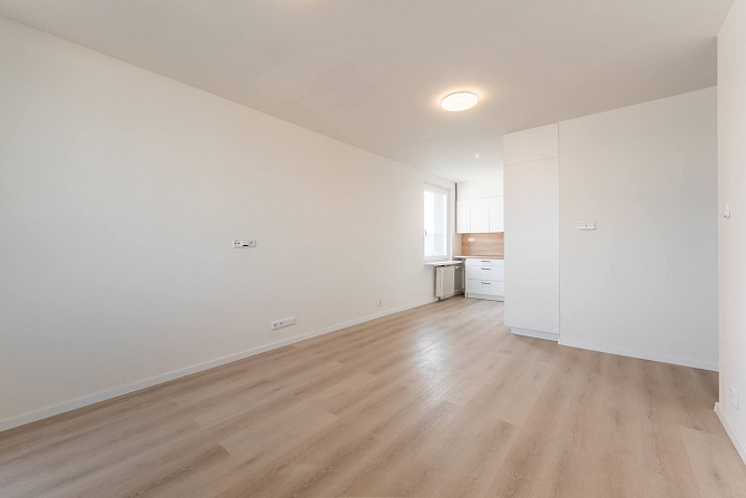 Byt má neprůchozí ložnici a obývací pokoj s novou, plně kuchyní vybavenou kombinovanou lednicí, indukční varnou deskou, troubou, MWT a digestoří. Koupelna se sprchovým koutem a umyvadlem je společná s toaletou.