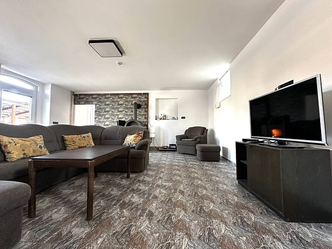 Částečně zařízený byt nabízí prostornou halu, obývací pokoj s krbem a kuchyní s vestavěnou linkou (součástí el. sporák, trouba, myčka a lednice) a koupelnu s rohovou vanou. Dále se v bytové jednotce nachází 3 prostorné pokoje. V bytě jsou položeny plovoucí podlahy a dlažba. K dispozici satelit a internet. Možnost vytápění celého bytu krbem s výměníkem a možností skladování paliva venku pod pergolou, případně vevnitř. Druhá možnost vytápění je elektrokotlem. Parkování ve dvoře až na dvě auta. Jedná se o velmi klidnou lokalitu s dobrou dostupností do Slaného (15 min) i do Prahy (40 min).
